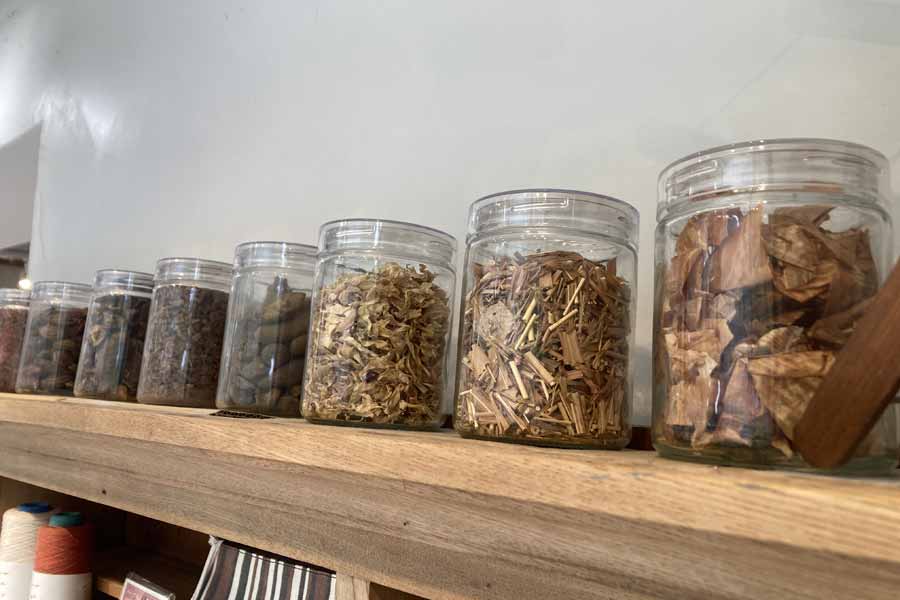 店内で印象的なのは、染料となる植物が瓶に収められ、実際の素材として展示されていること。「この実からこの色が生まれるのか」と、思わず足を止めて見入ってしまう瞬間も少なくありません。