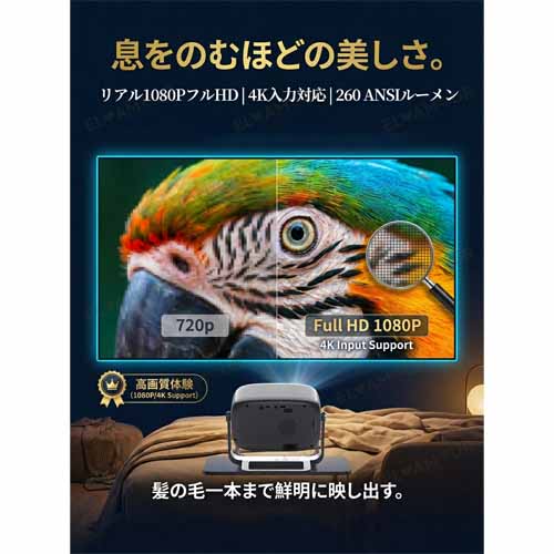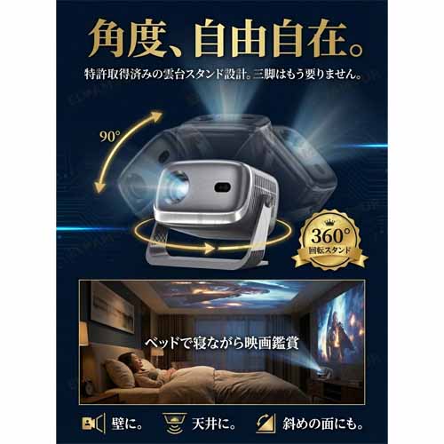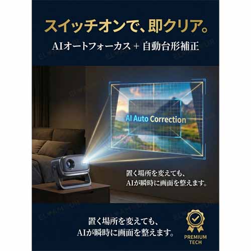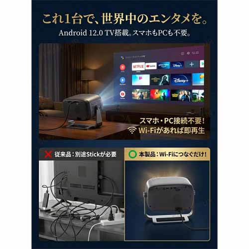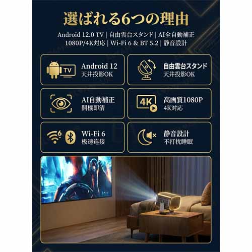 4K入力対応のネイティブ1080Pで、最大250インチの大画面投影ができる家庭用プロジェクター。自動台形補正とAIオートフォーカス機能によって設置・導入が簡単で、天井投影にも対応。Wi-Fi 6&Android12搭載なので、好きなコンテンツにすぐアクセスできます。