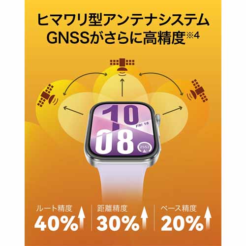 薄さ約9.5mm、重さ約27gのスリム&軽量ボディが魅力のスマートウォッチ。約1.82インチの画面サイズいっぱいにデジタル表示されて見やすさも◎。100種類位以上のワークアウトモードや睡眠管理機能がサポートされ、機能も申し分なし。通常使用で約10日間のロングバッテリーに信頼がおけます。