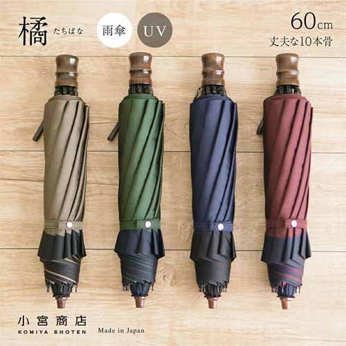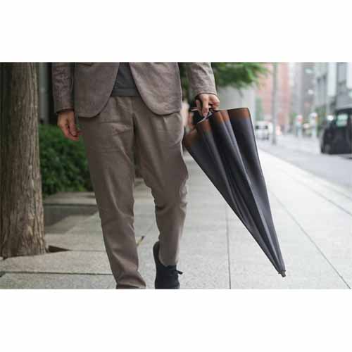 親骨の長さは約60cmでしっかり雨を防ぎながら、収納時はスリムで持ち運びやすい2段折タイプ。シャリ感のある甲州織のポリエステル生地と、職人の技術で仕立てた骨組みが高耐久を実現。東京都台東区の老舗・小宮商店ならではの品質とデザイン性で、シックで知的な印象を与えてくれます。