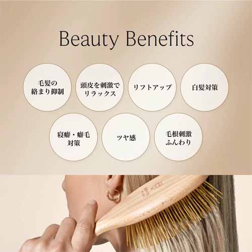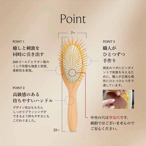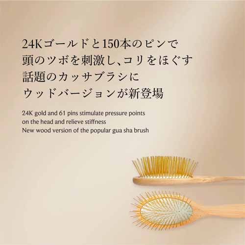 東洋のリフレクソロジー発想と職人の技術が融合した、100%ハンドメイドの逸品。24Kゴールドメッキの151本のピンが頭皮を心地よく刺激し、健やかなスカルプ環境と髪のボリューム感を叶えてくれます。頭皮から首・肩にかけての血行を促進し、顔まわりのむくみ・重だるさをやわらげる効果も。