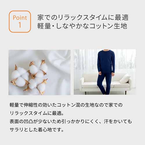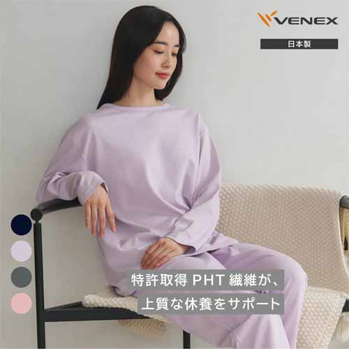 VENEX独自の「PHT繊維」が使用された、軽量で伸縮性の効いたコットンブレンドのセットアップ。滑らかでしなやかな肌触りで血流促進や疲労回復をサポートします。吸湿・通気性にも優れていて、オールシーズン快適に過ごせます。