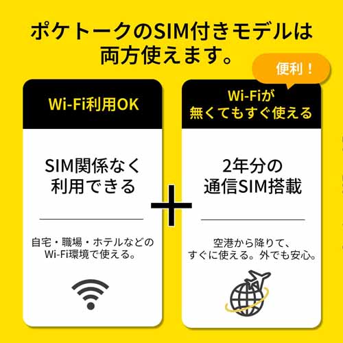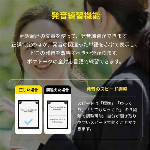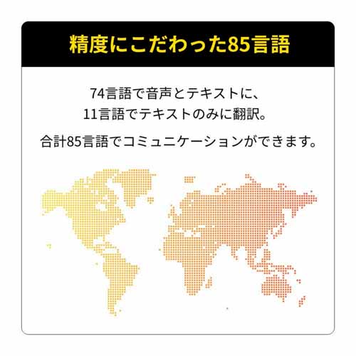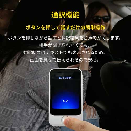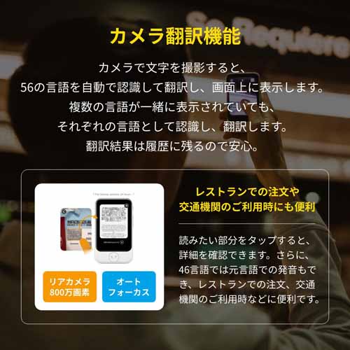 世界85言語に対応し、SIM内蔵でWi-Fiが無くてもすぐに使えて便利。音声通訳だけでなくカメラ翻訳機能も搭載され、看板やメニューも瞬時に翻訳可能。発音練習や会話のレッスンにも活用できる優れものです。