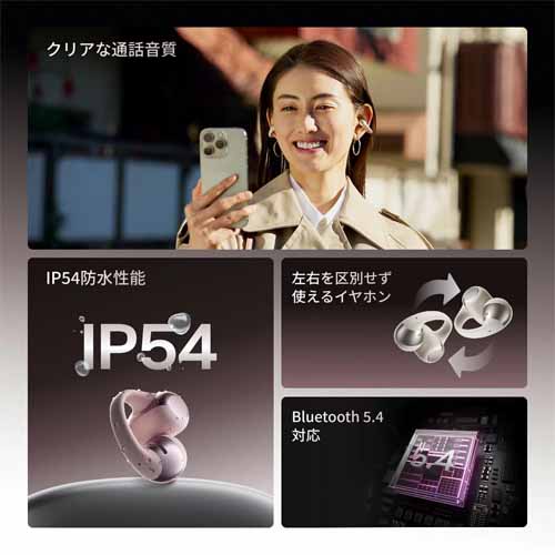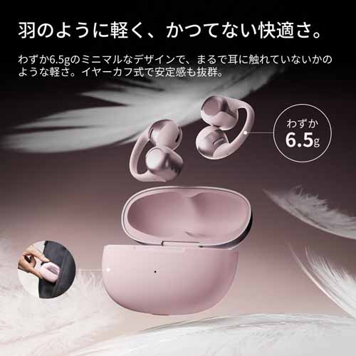 耳を塞がずに音を聴ける骨伝導技術を活用したワイヤレスイヤホン。周囲の音が聞こえやすいため、ランニングやサイクリングでも快適に使えます。わずか6.5gのミニマルなデザインで、まるで耳に触れていないかのような軽さを感じます。