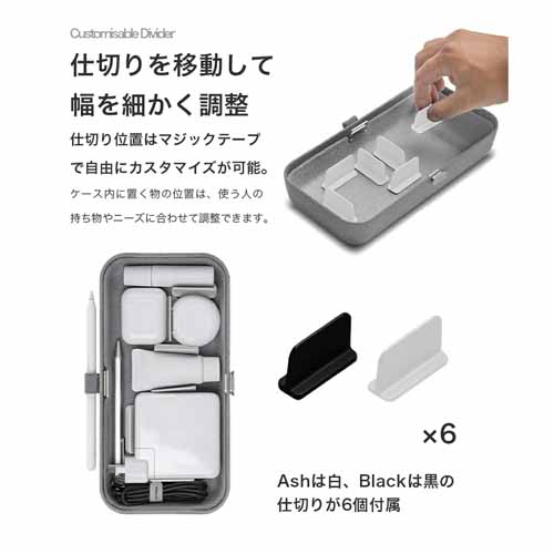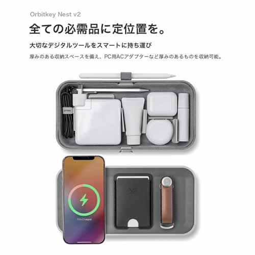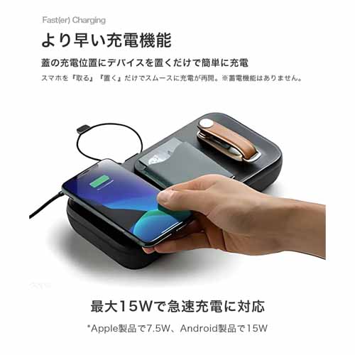 ワイヤレス充電パッド搭載のトップカバーと、カスタマイズ可能な内部仕切り。マウス・充電器・USB・名刺などをまとめて収納でき、12cm×24cmのサイズ感で持ち運びも◎。厚い収納スペースだけでなく、収縮バンド付きポケットで薄いものも細かく収納できてとにかく便利です。