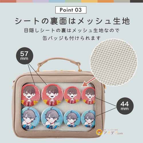 クリア素材の前面ポケット付きで、縦なら約21cm、横なら約16cmのぬいぐるみが2体ほど入ります。人目が気になる場所では、付属の目隠しシートを入れることでぬいぐるみを隠せ、その裏面はメッシュ生地なので缶バッジも付けられます。