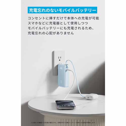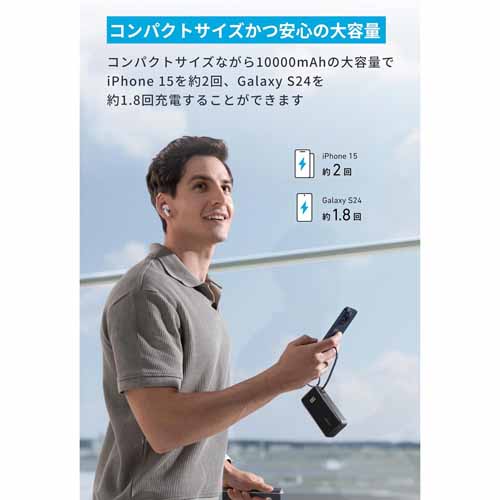 容量10,000mAhでスマホ約2回分をフル充電可能。モバイルバッテリー、USB急速充電器、USB-Cケーブルがひとつにまとまっていて、他に充電器やケーブルを持ち運ぶ必要がありません。PSE認証取得の安全設計で、アウトドア使用も安心です。
