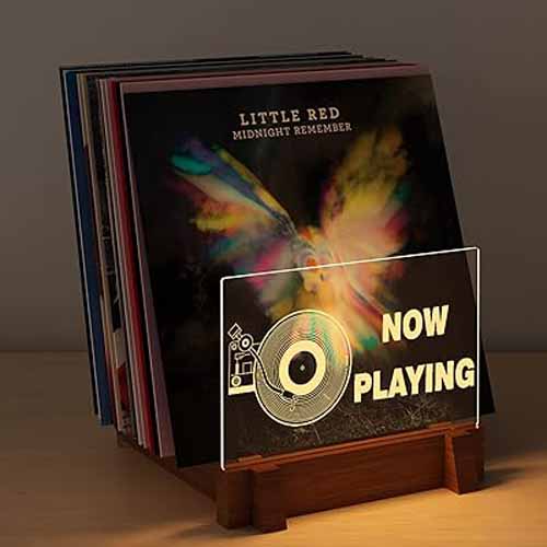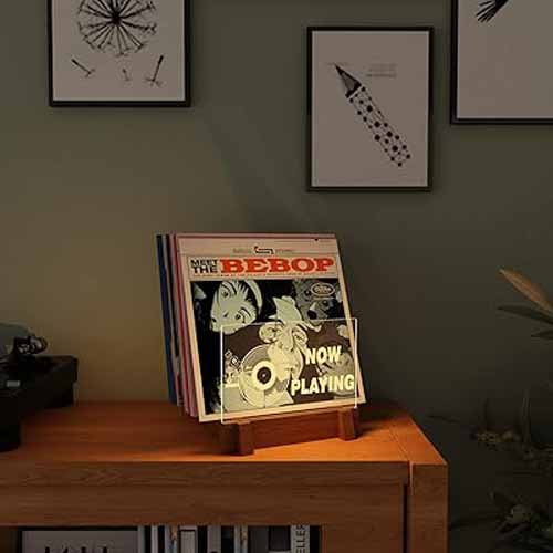 木製ベース×アクリルプレートの組み合わせで高級感ある仕上がり。LPサイズ対応で、最大40枚のレコードアルバムを収納できます。差し替えもカンタンにでき、イルミネーションLEDが音楽好きの気分を高めてくれます。