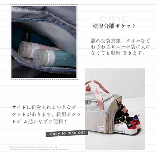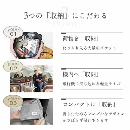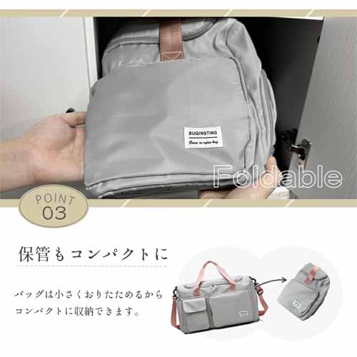 大容量35Lサイズながら軽量設計で、機内持ち込みもできます。キャリーバッグのハンドルに固定できるベルト付きで、移動時の負担を軽減します。折りたためるタイプなのでコンパクトに収納できる点も◎。斜め掛けも手提げもOKで、使い勝手バツグンです。