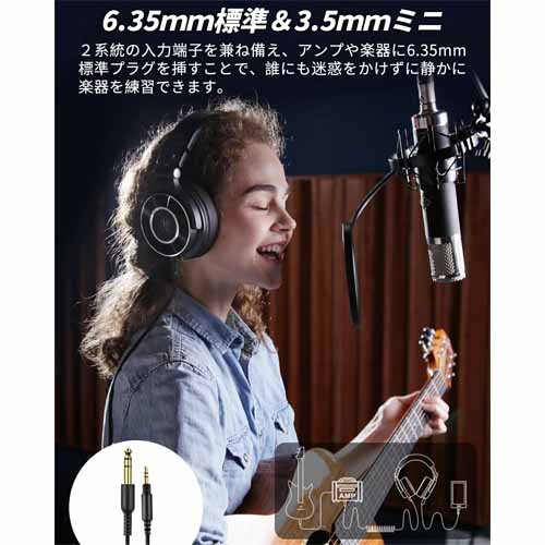 アンプや楽器に6.35mm標準プラグを挿すことで、静かに楽器練習ができます。2台のヘッドホンを繋ぎ、ふたりで1つのソースをシェアできることも便利。