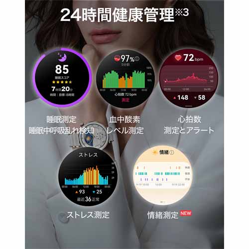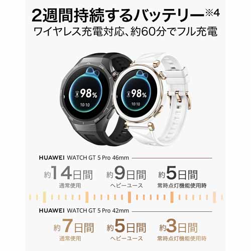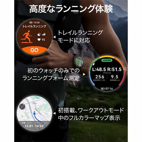 1.43インチAMOLEDディスプレイ搭載。音楽再生・通話・心拍数・睡眠・ストレスモニタリングに対応したスマートウォッチです。約14日間のロングバッテリーを実現し、ワイヤレス充電にも対応。防水5ATM仕様で、運動中や雨天時の使用も安心です。