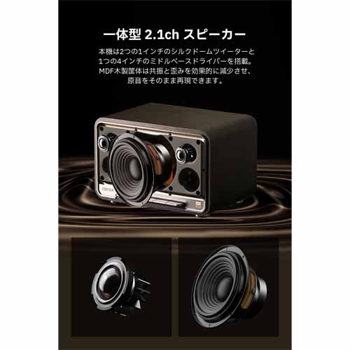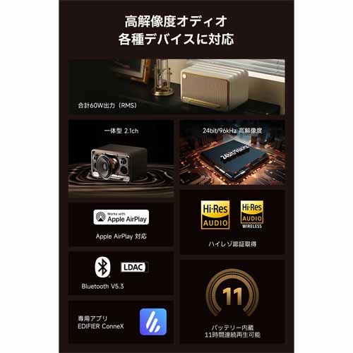 デュアルツイーターとウーファーによる2.1ch構成で、深みのある低音と透明感ある高音を実現。最大出力60Wのハイパワー設計でありながら、コンパクトで11時間連続再生が可能。上質な音環境を求める人に最適なプレゼントです。