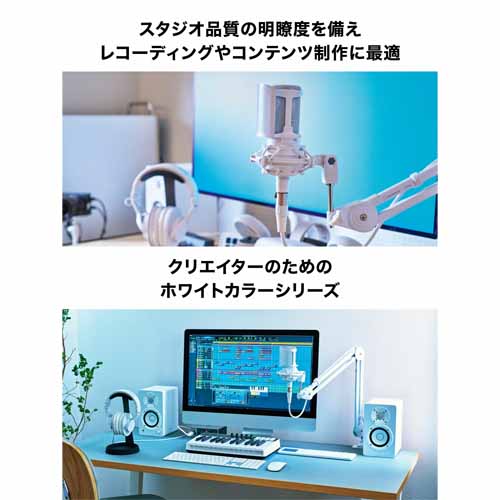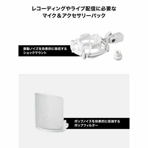 ホワイトで統一した専用ショックマウントとポップフィルターを付属。モニターヘッドホンやオーディオミキサーなど、他にもホワイトカラーモデルを多数展開。