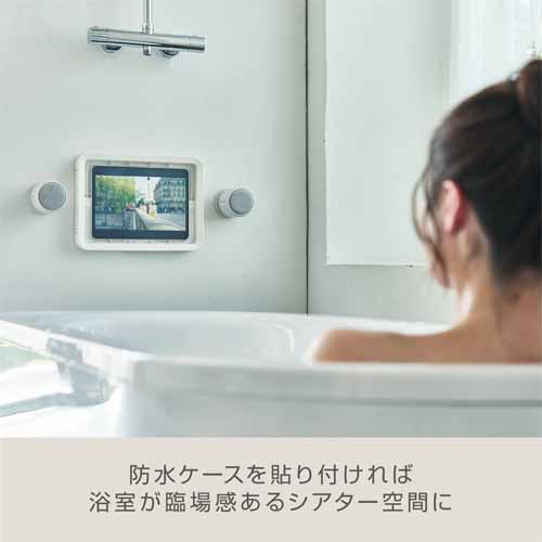 充電スタンドにセットすれば、屋外にも持ち運びがカンタン。お手持ちのタブレットと別売の防水ケースを組み合わせれば、お風呂で映画鑑賞も楽しめます。