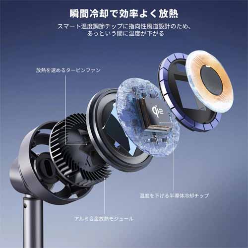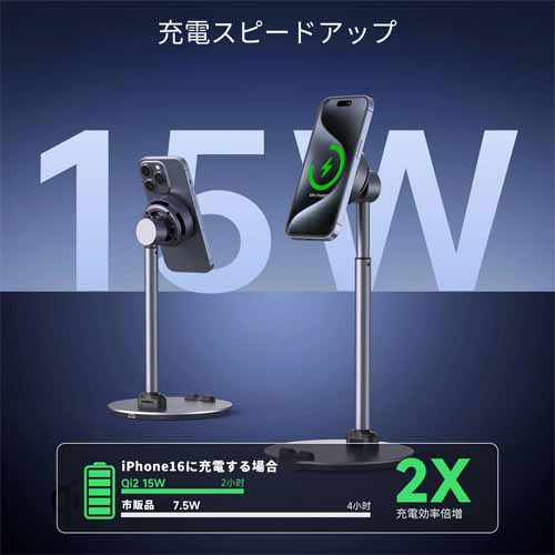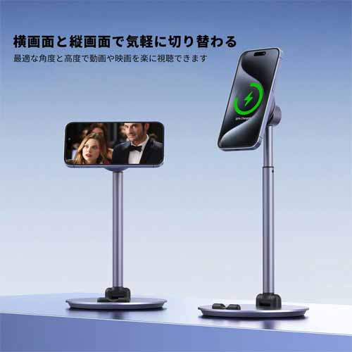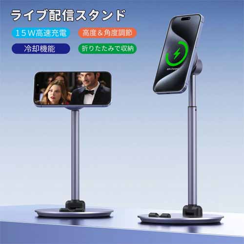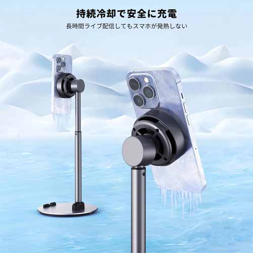 マグネットタイプでスマホを瞬時吸着し、ワイヤレス充電機能もついたスマホスタンドです。冷却テクノロジーが搭載され、スマホ発熱対策も◎。縦画面でも横画面にも対応していて、1日中ライブ配信を楽しむことができます。