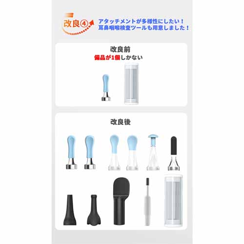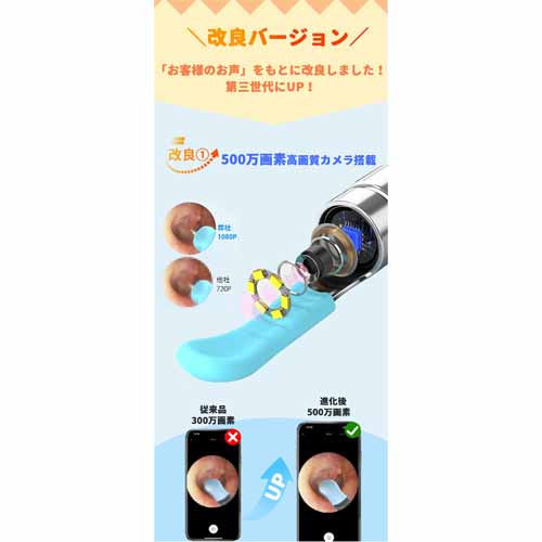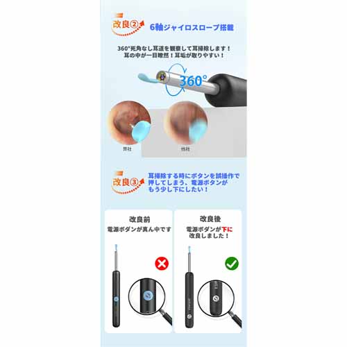 1080P・500万画素の高性能カメラを搭載し、リアルタイムで映像確認が可能。断熱性樹脂材料が採用され、 自動で人体に近い温度に設置されるので、耳に優しく安全設計。多種の耳かきヘッド付きで家族内での共用もできます。