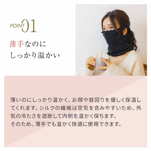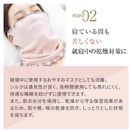 シルク×コットンのMIX素材で、保湿性・保温性・吸湿性・放湿性に優れたシルク保湿マスク。耳穴付きで使いやすく長時間使用しても蒸れにくいため、寝ている間も乾燥対策ができます。