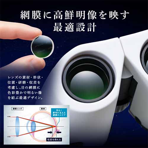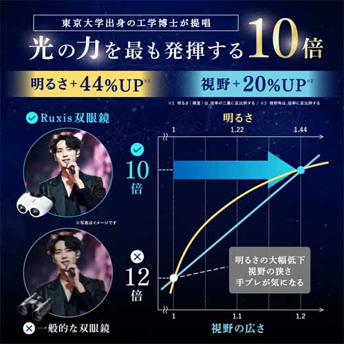 倍率は光の力を最も発揮する10倍、透光率99.5%以上の最先端光学レンズで、明るくクリアな映像を実現。9層のフルマルチコーティングが、夜公演や屋内でも高い視認性を発揮します。65°の広視野で、手ブレを軽減するアイカップも嬉しいポイント。
