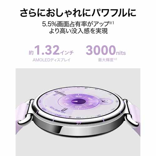 1.32~1.43インチAMOLEDディスプレイ搭載。音楽再生・通話・心拍数・睡眠・ストレスモニタリングに対応したスマートウォッチです。約21日間のロングバッテリー(41mmモデルは14日間)を実現し、ワイヤレス充電にも対応。防水5ATM仕様で、運動中や雨天時の使用も安心です。