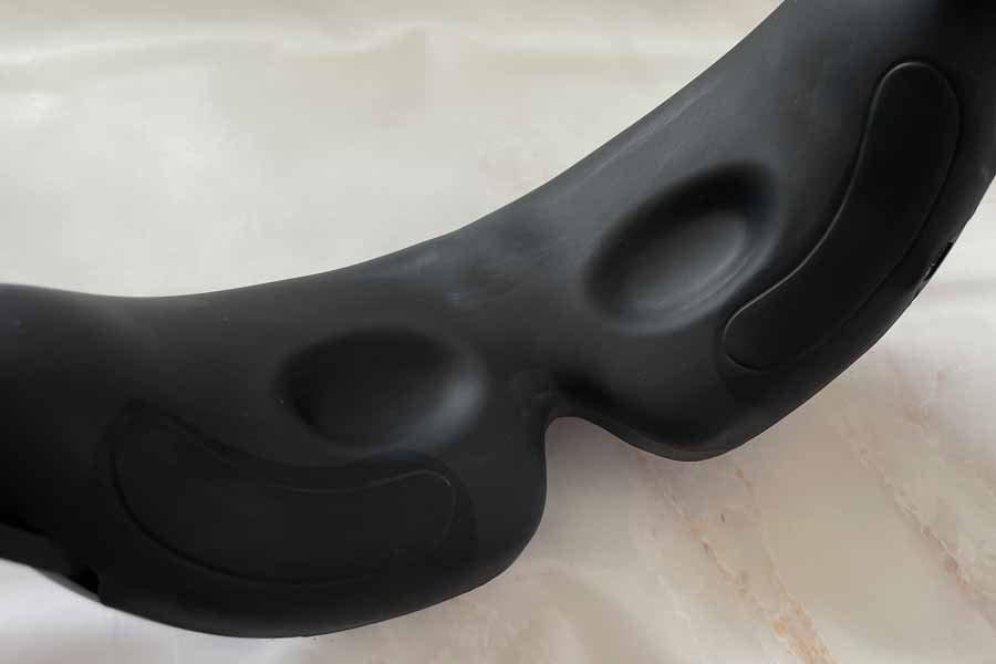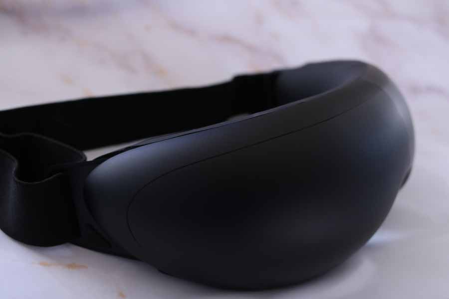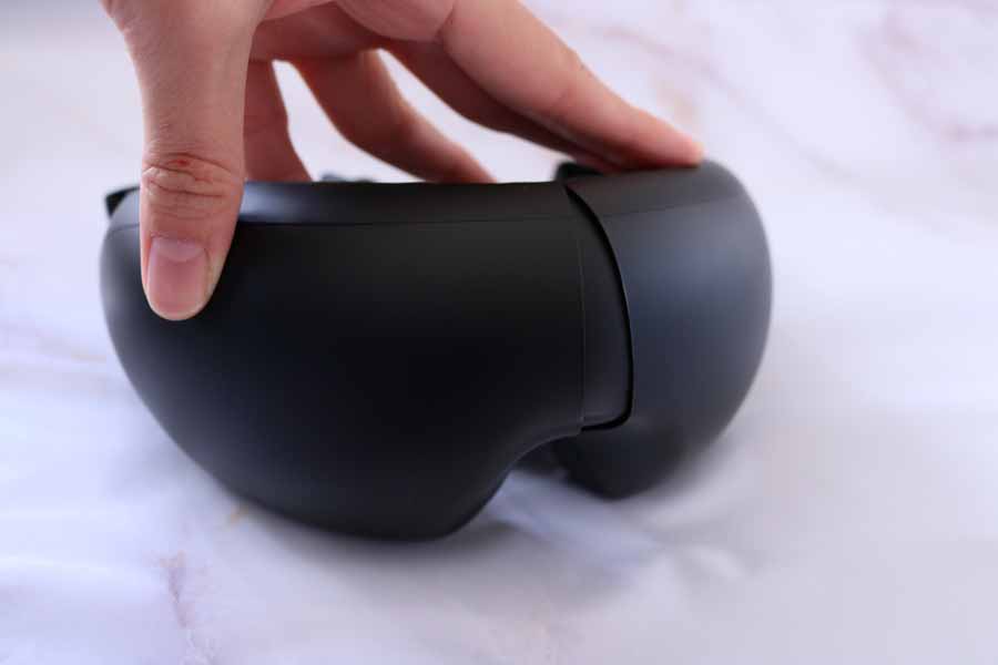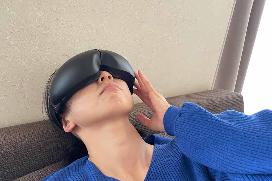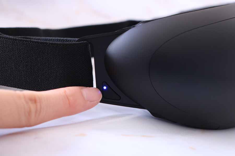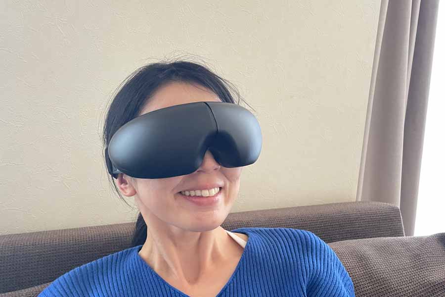 実際に装着してまず驚いたのは、フィット感のよさ。多少の不安定さを感じましたが、おおむね目元に沿ってフィットします。目元に触れるクッションの肌あたりがふわっとやさしく、電源を入れる前からリラックスを誘うような心地よさがあります。