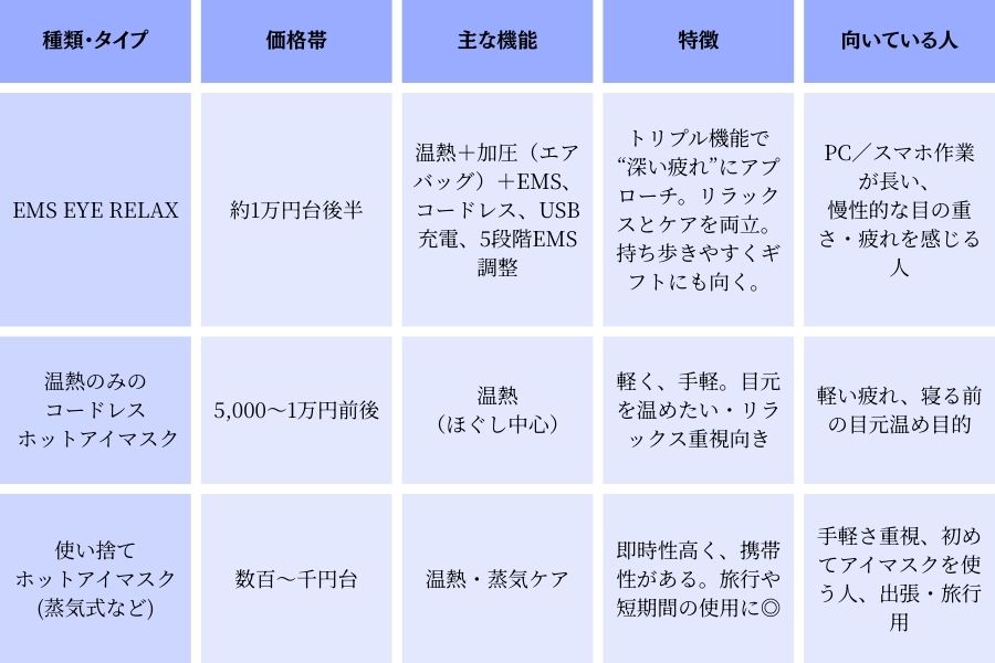 もちろん、「温熱だけで十分」「とにかく手軽さ・軽さ重視」というニーズが強い人には、価格が安く、軽量で準備も手軽な“温熱のみアイマスク”や“使い捨てホットアイマスク”のほうが向いています。目的と相手のライフスタイルに合わせて選ぶことをおすすめします。