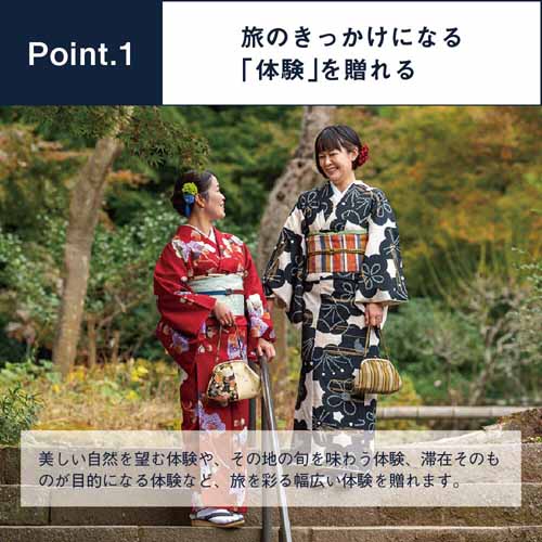 宿泊券だけでなく、体験チケットもセットでプレゼントすることで、心遣いが伝わるとともに旅の満足度も格段にアップします。長時間の移動に不安がある両親には、温泉体験チケットを贈ることで日帰りの温泉旅行としても活用できます。