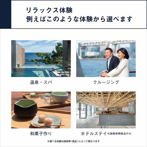 温泉旅行は、日本人ならではの四季の移ろいを楽しめるとともに、人生における刺激と癒しを同時に味わうことができる珠玉の体験。旅行系のギフトカードやカタログギフトであれば、事前に両親と調整せずに贈ることができるので、不必要に遠慮されてしまうことなく、サプライズ感のあるプレゼントになります。