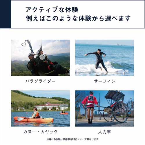旅行と一緒に、観光や体験も楽しんでほしい。そんな想いを込めるなら、日帰り温泉や食体験、アクティビティが選べる体験型ギフトがおすすめです。体を癒すだけでなく、新しい思い出もつくってもらえる、ワクワクが詰まったプレゼントです。