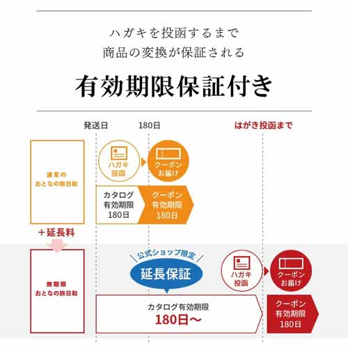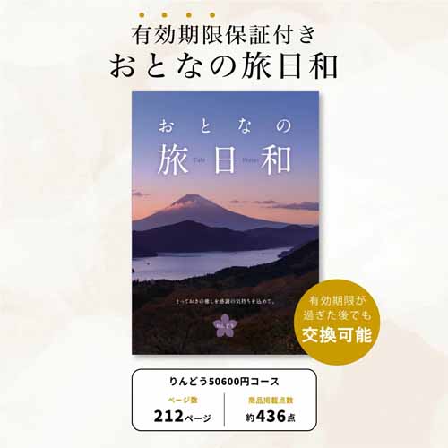 大人世代をターゲットにした「おとなの旅日和」は、3万円台の「なでしこ」、5万円台の「りんどう」が用意されています。ご紹介する「有効期限延長保証付き」のプランは、ハガキを投函するまで商品の交換が保証されるサービスが含まれていて、両親への思いやりも添えることができます。