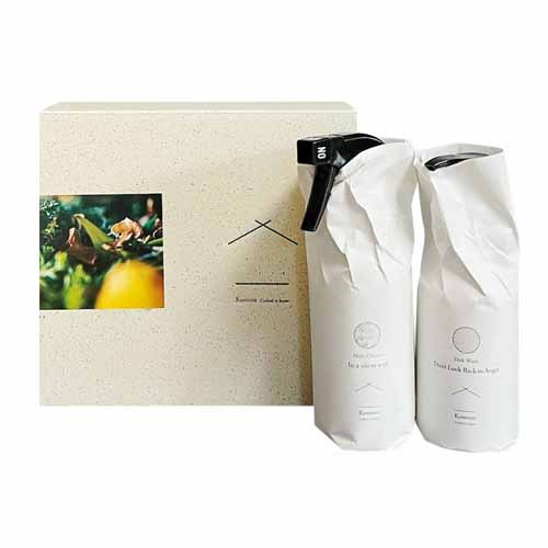 調香師が手掛けた100%天然アロマオイル使用の国産洗剤セット。キッチン用洗剤は天然の保湿剤を配合し、水仕事のダメージから手肌を守り保湿もします。柑橘やハーブの爽やかな香りが特徴で、室内に心地よい香りが漂うことも魅力。品のあるギフトボックス入りで、贈り物にも映えるデザインです。