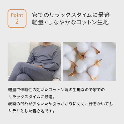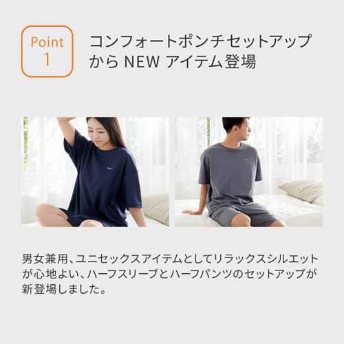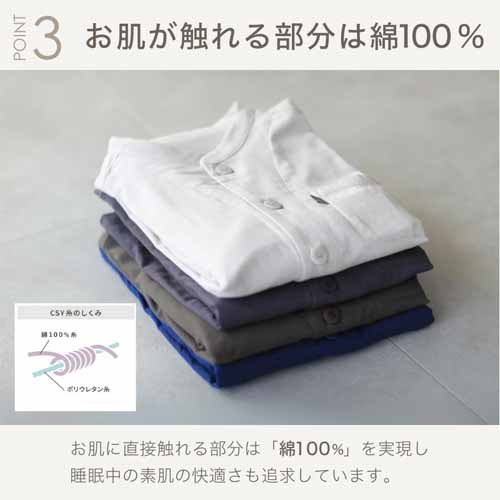 特殊繊維「PHT」を採用し、副交感神経に働きかけて質の高い休息をサポート。軽く柔らかな着心地で、ストレスなく着られます。ユニセックスデザインかつカラーバリエーションが豊富なため、夫婦やカップルでお揃いにしてもおしゃれです。