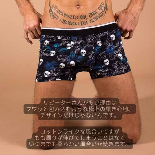 滑らかなコットン生地を使用し、肌触りと通気性の良さにこだわった一枚。個性的な柄ながら上品な色使いで、履き心地も快適です。パッケージも洗練されており、2枚ほどセットで贈ればセンスの良いギフトに仕上がります。