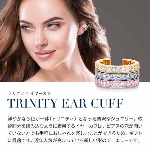 K18素材のトリニティデザインが耳元に上品な輝きを添えるイヤーカフ。3つのカラーとキュービックジルコニアが華やかな印象です。軽くフィットし、長時間つけても痛くなりにくい仕様で、頻繁に使っていただけます。単体でも重ねづけでも美しく、シーンを選ばず使える万能アクセサリーです。