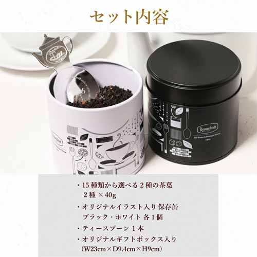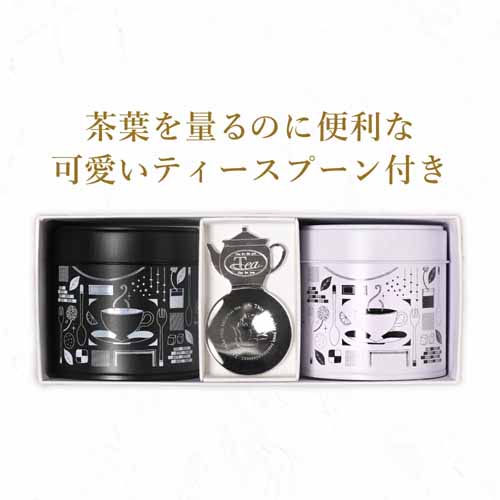 13種類から選ぶ2種の茶葉と、オリジナル缶、ティースプーンが付いた紅茶のセット。茶葉の味わいを際立たせた上質な紅茶は香りから気持ちを高揚させます。高級感があり、使い終わった後も小物入れとして楽しめるデザイン性の高い缶も特徴です。