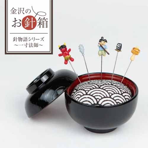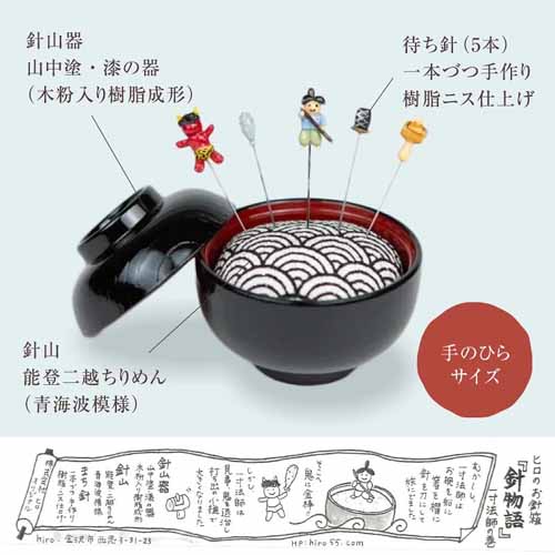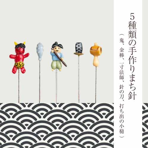 「一寸法師」のキャラクター待針。鬼、金棒、一寸法師、針の刀、そして打ち出の小槌の5本の待針と青海波模様の針山のセットです。針は一本ずつ職人が手作りしたもの。見ていて気持ちの良い細さです。