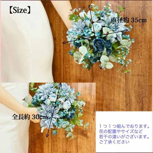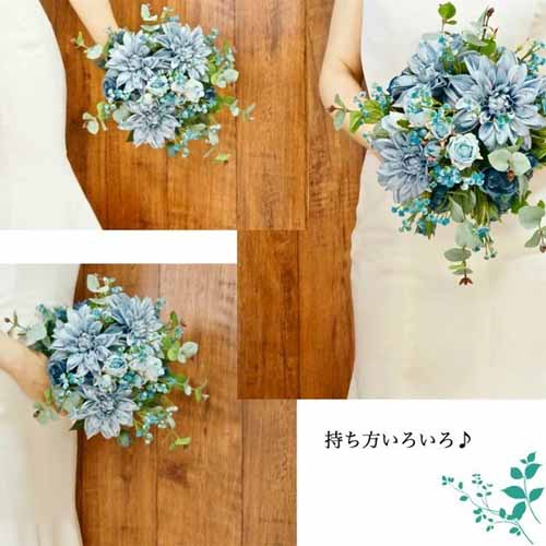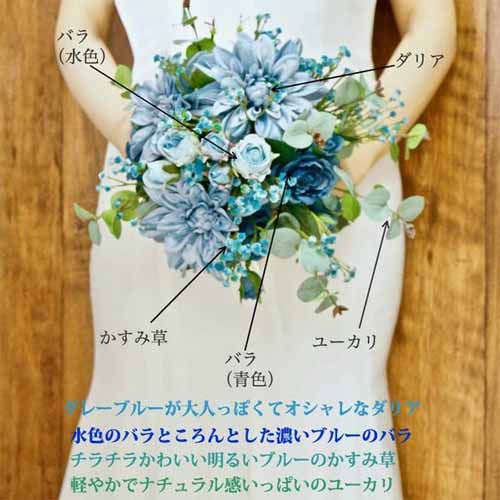 生花と見間違えるほど高品質なアーティフィシャルフラワーを使用し、鮮やかなブルーグラデーションがドレスに映える華やかさを演出します。青・水色のバラ、ダリア・ユーカリ・かすみ草があしらわれ、生花に近い造花のみがセレクトされています。