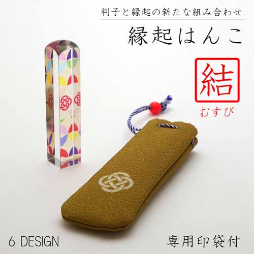 色どり豊かな和柄と水引を印象的にあしらった個人用の12ミリ角印。七宝・菊・うさぎ・矢絣・菱・工字繋ぎなど、縁起をかついだり幸せへの願いを込めてモチーフを選ぶことができます。角印は、彫刻のデザインを楽しめる落款印としての用途でも使えて便利ですね。