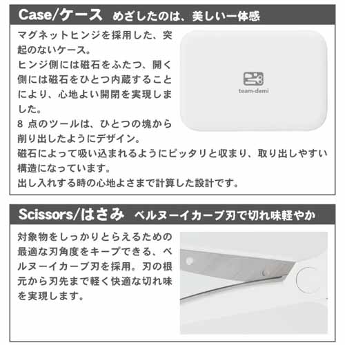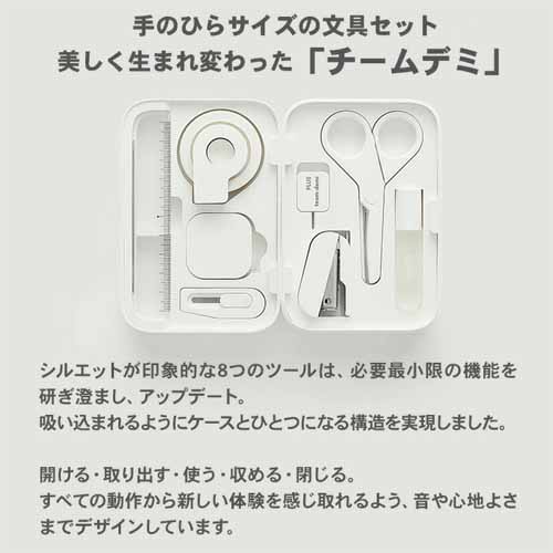 PLUSのteam-demiは、コンパクトなケースに文房具をまとめた便利なステーショナリーキットです。ハサミやテープなど必要な道具がそろっており、デスクやバッグに入れておくと便利。デザイン性も高く、女性へのプレゼントとしても人気があります。