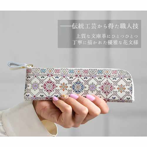 白革に型押しと彩色を施した文庫革ならではの美しいデザインが特徴。耐久性にも優れており、長く愛用できるペンケースです。ファスナー仕様で開閉しやすく、ペンをすっきり収納可能。和の上品さと機能性を兼ね備えた文房具です。