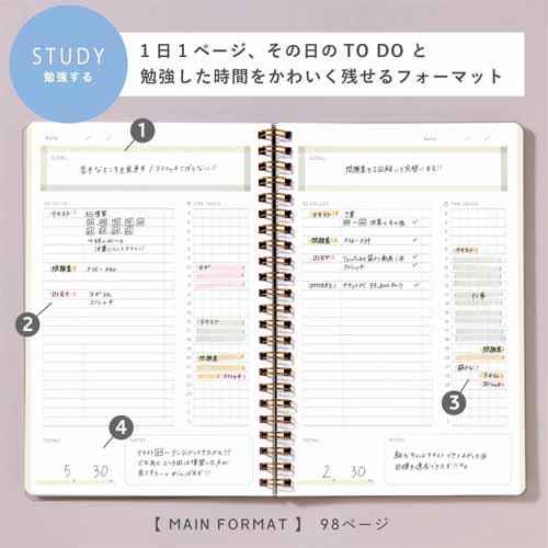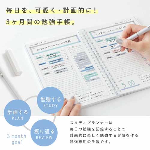 &studiumのスタディプランナーは、勉強や仕事のタスク管理に役立つノートです。スケジュールや目標を整理できる構成で、計画的に作業を進めたい女性におすすめ。おしゃれなデザインで使う楽しさもあり、日々のモチベーションを高めてくれる文房具です。