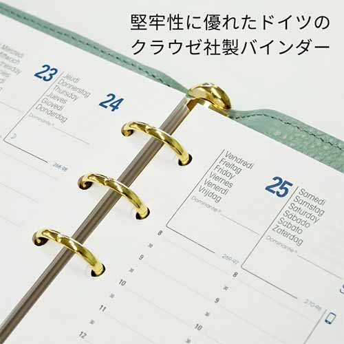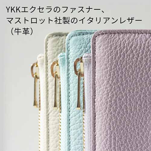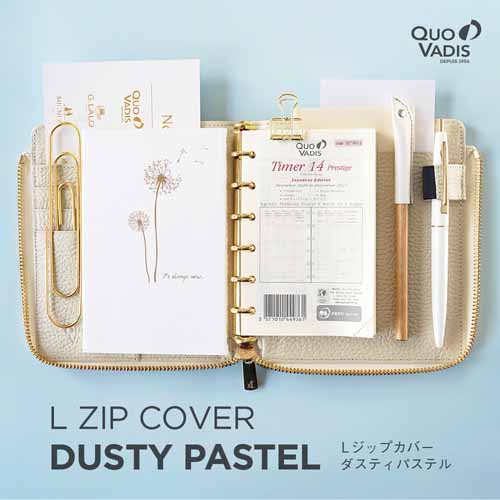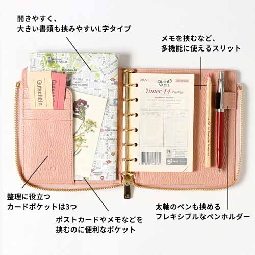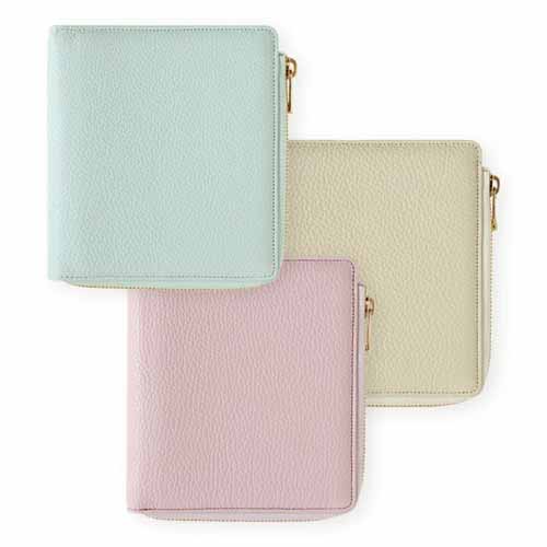 Lジップタイプの手帳カバーで、中身をしっかり保護できる設計。ポケット付きでカードやメモを収納できるなど、機能性にも優れています。落ち着いたパステルカラーが上品で、ビジネスシーンにもなじむデザインです。