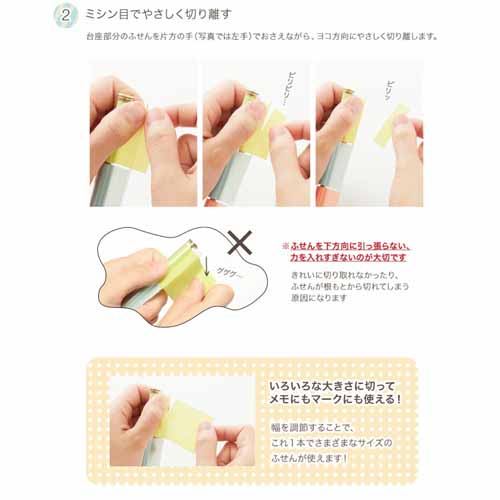 フィルム素材の付箋で破れにくく、ページのマーキングやメモに便利。ペン型ケースに収納されているため持ち運びやすく、デスクやペンケースにもすっきり収まります。シンプルで使いやすいデザインも魅力です。