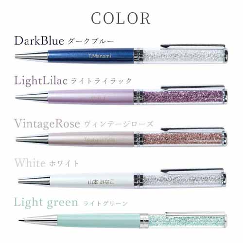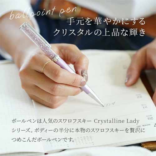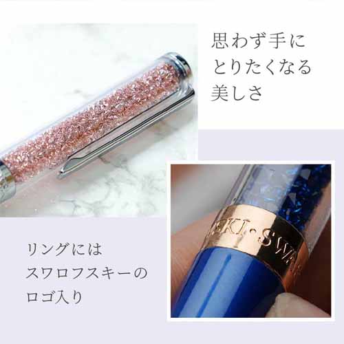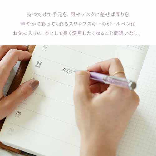 ボディ内部にあしらわれたスワロフスキークリスタルが、光の角度によって美しく輝く上品なデザインが特徴です。なめらかな書き心地のボールペンで、普段使いにも最適。スリムで持ちやすい形状のため長時間の筆記でも疲れにくく、見た目の華やかさと実用性を兼ね備えた文房具です。