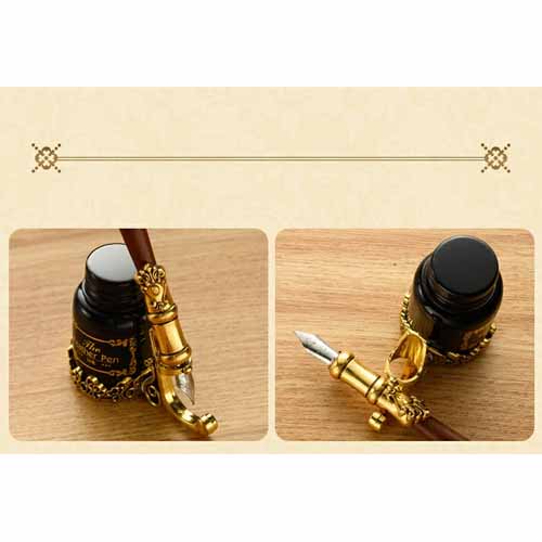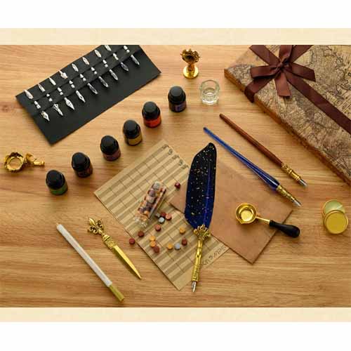 羽ペンやガラスペン、インク、スタンプなどがそろった34点セットで、すぐに使用できる充実した内容。クラシックなデザインでデスクインテリアとしても楽しめます。手紙やメッセージカードを書く時間を優雅に演出してくれる文房具です。