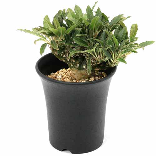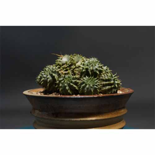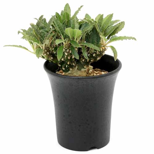 黒鉢に入ったホリダ ユーフォルビア。南アフリカの乾燥地帯に自生する多肉植物で、毎年咲く花が散ると花茎(かけい)が少しずつ乾燥し、トゲのようになります。背が低くずっしりと安定感のあるルックスが魅力。