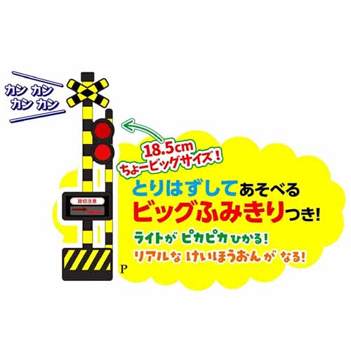 ビッグサイズの踏切は、取り外しても遊べる2WAY仕様。効果音ボタンのバリエーションも豊富で、飽きずに長く楽しめることが魅力です。