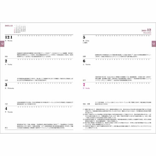 全国JR・私鉄の詳細路線図だけでなく、鉄道の記念日や豆知識など鉄道トリビアが詰まってとにかく内容が豊富。スケジュール欄は書き込みやすく、手帳としての使い勝手も抜群です。