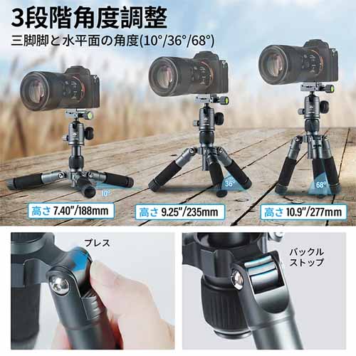 耐荷重に優れ、小型ながら一眼カメラもしっかり支えられる強度を確保。開脚角度を調整でき、低いアングルから迫力ある写真が撮れるのも魅力。折りたたみ時は非常にコンパクトで持ち運びが快適。アルミ合金で高耐久、長く使えるプロ仕様のアイテムです。