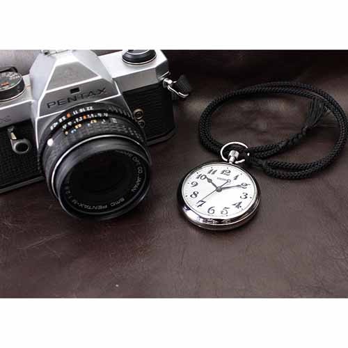 クオーツ式の高精度ムーブメントを搭載して正確な時間を刻み、シンプルな文字盤でポケットからパッと取り出したときも見やすい仕様です。風防素材のカーブアクリルガラスとステンレススティールのケースで耐久性も抜群。手に収まりのよいサイズ感で持ち運びも快適です。