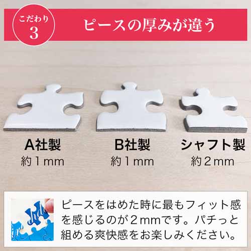 高画質プリントで写真をそのまま鮮明に再現。35ピースは大人が楽しむのに程よい難易度で、完成後は額に入れて飾れるクオリティです(フレームや収納ボックスのオプションあり)。パズルの厚みがしっかりしていて、パチッとはめたときのフィット感を感じます。